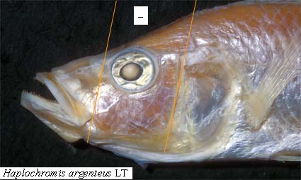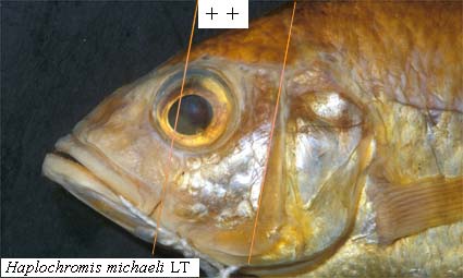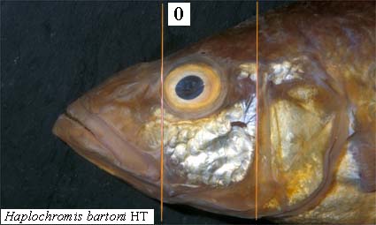 Die "vertikale" Linie (MxPE) durch die hintere Spitze des Unterkiefers verläuft parallel zu einer Bezugslinie, die durch den hinteren, vertikalen Rand des Präoperculum verläuft (genauer an seiner Grenze zur Wangenmuskulatur) | The "vertical" line (MxPE) through the caudal tip of the maxilla has been drawn parallel to a reference line through the rostral margin of the vertical preopercular limb (more precisely through its border with the cheek musculature) |