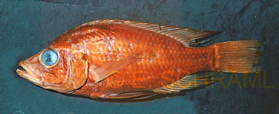 Teeth: In the outer row of both jaws the teeth are tall, slender and slightly curved. Fishes between 67 and 90 mm SL have unicuspid teeth anteriorly, and weakly bicuspid teeth laterally and posterolaterally. Larger fishes have only unicuspids in the outer row. The anterior teeth in the upper jaw of the largest specimens may be relatively enlarged (i.e. stouter and longer than the lateral teeth). There are 40 - 64 (M = 48) teeth in the outer, upper row. The inner rows of the upper jaw are composed of tricuspid teeth in fishes < 90 mm SL and a mixture of uni- and tricuspids in larger fishes; there is an increased proportion of unicuspids in specimens > 115 mm SL. In fishes over 100 mm SL the outermost row of inner series is often composed of unicuspids and the remaining rows of tricuspids. The inner rows are widely spaced in most fishes so that the teeth form a broad band anteriorly and anterolaterally. There are 3 or 4 rows of teeth in the upper jaw. In the lower jaw of most specimens less than 120 mm SL, only tricuspid teeth are found, but some unicuspids also occur in fishes of this size group. Larger individuals have a mixture of tri- and unicuspid or tri- and weakly tricuspid teeth; only rarely are all the lower, inner teeth unicuspid. There are 2 (mode) or 3 rows of inner teeth in this jaw. Coloration: Live colours: Males (sexually active) have a slatey-blue ground colour, darkest dorsally. Dorsal fin smokey-grey with a pale red margin and a deep red flush on the soft part. Caudal dark grey with deep red streaks between the rays. Anal dark hyaline with a dull maroon flush, and orange-red ocelli. Pelvics black. Females (adult and quiescent): dorsal surface yellowish-grey shading to silver on the flanks and belly. Dorsal fin hyaline but with a yellowish base. Anal and caudal dark hyaline. Pelvics hyaline. Trophic group: The apparently vegetarian diet of H. acidens is at variance with the dentition and general facies which are essentially those of a piscivorous predator. The length of the gut (1 1/2 to 2 times SL) is greater than in the piscivores, but is not as long as the gut in purely phytophagus species. |